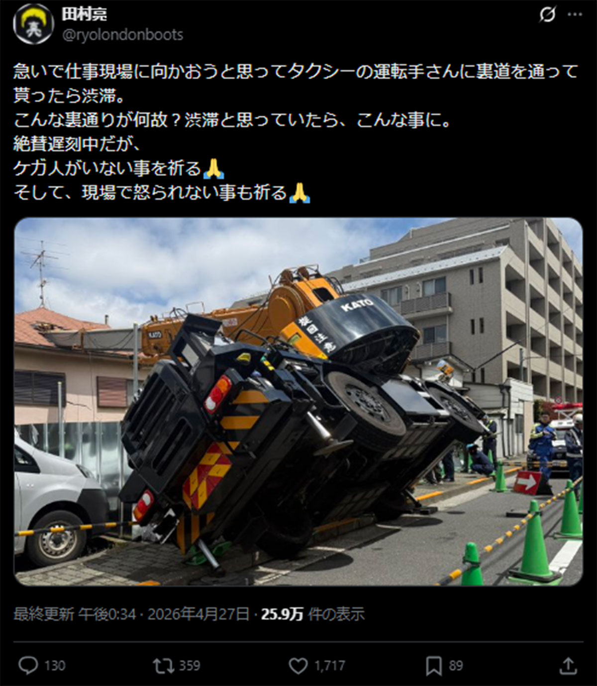 田村亮、移動中に「クレーン転倒事故」…仕事遅刻も「ケガ人がいない事を祈る」SNSでは“現場の不備”指摘する声も(画像1/3)公開日:2026.04.28 更新日:2026.04.28