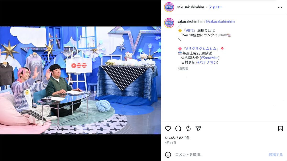 『サクサクヒムヒム☆推しの降る夜☆』(日本テレビ系)で共演する「Snow Man」の佐久間大介とバナナマンの日村勇紀(番組のInstagram《@sakusakuhimhim》に4月14日投稿)