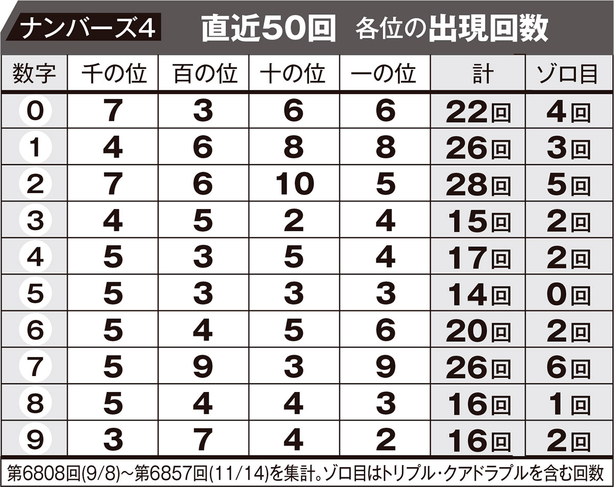ナンバーズ4 直近50回 各位の出現回数