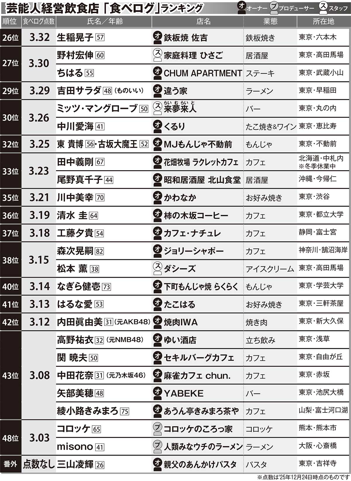 芸能人経営飲食店 「食べログ」ランキング(1位〜25位)