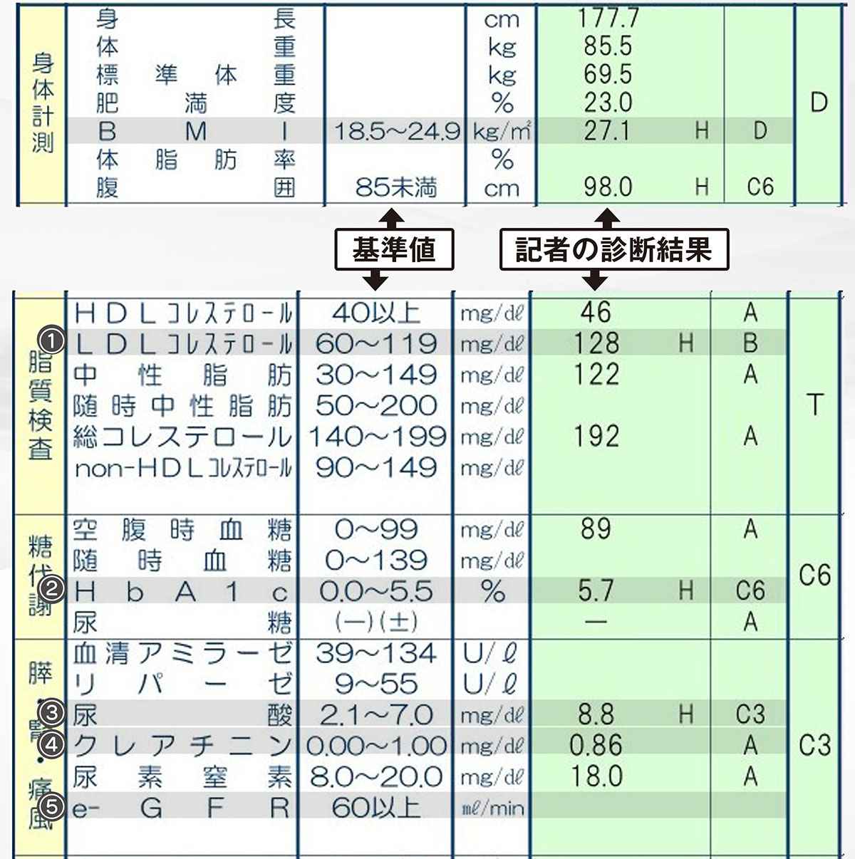 (2)【ヘモグロビンA1c】「糖尿病の指標となる数値で、5.7〜6.4%は“予備軍”とされます。6.5%を超える場合は糖尿病の疑いがあり、精密検査が必要です。ただ、6.0%以下であれば大きな問題はないと考えられます。糖尿病の発症には遺伝的要因も関係しますが、暴飲暴食によって膵臓が疲弊し、インスリンの分泌が低下することも大きな要因です。また、脂肪組織はインスリンの働きを妨げるホルモンを分泌するため、肥満の人ほど発症リスクが高まります。数値の上昇を防ぐには、過度に太らないこと、そして筋肉量を維持・向上させることが重要です。有酸素運動と筋力トレーニングの両立が効果的です」