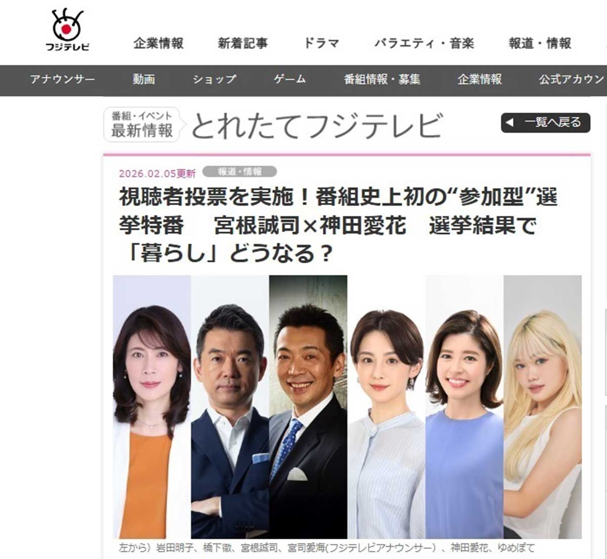 フジ選挙特番、高市首相の回答途中に中継“ブツ切り”で視聴者から「失礼すぎる」相次ぐ非難(画像1/17)公開日:2026.02.09 更新日:2026.02.09