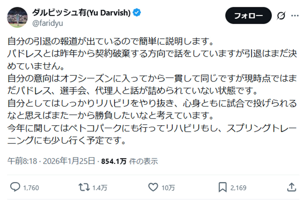 ダルビッシュ有「電撃引退」報道に “意味深” アンサー…過去には故障で「年俸破棄」したことも(画像1/13)公開日:2026.01.26 更新日:2026.01.26